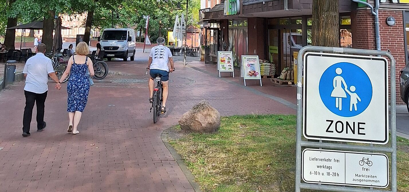 In der Fußgängerzone in Soltau dürfen Radfahrer mit Schrittgeschwindigkeit fahren – außer an Markttagen © M. Hoops