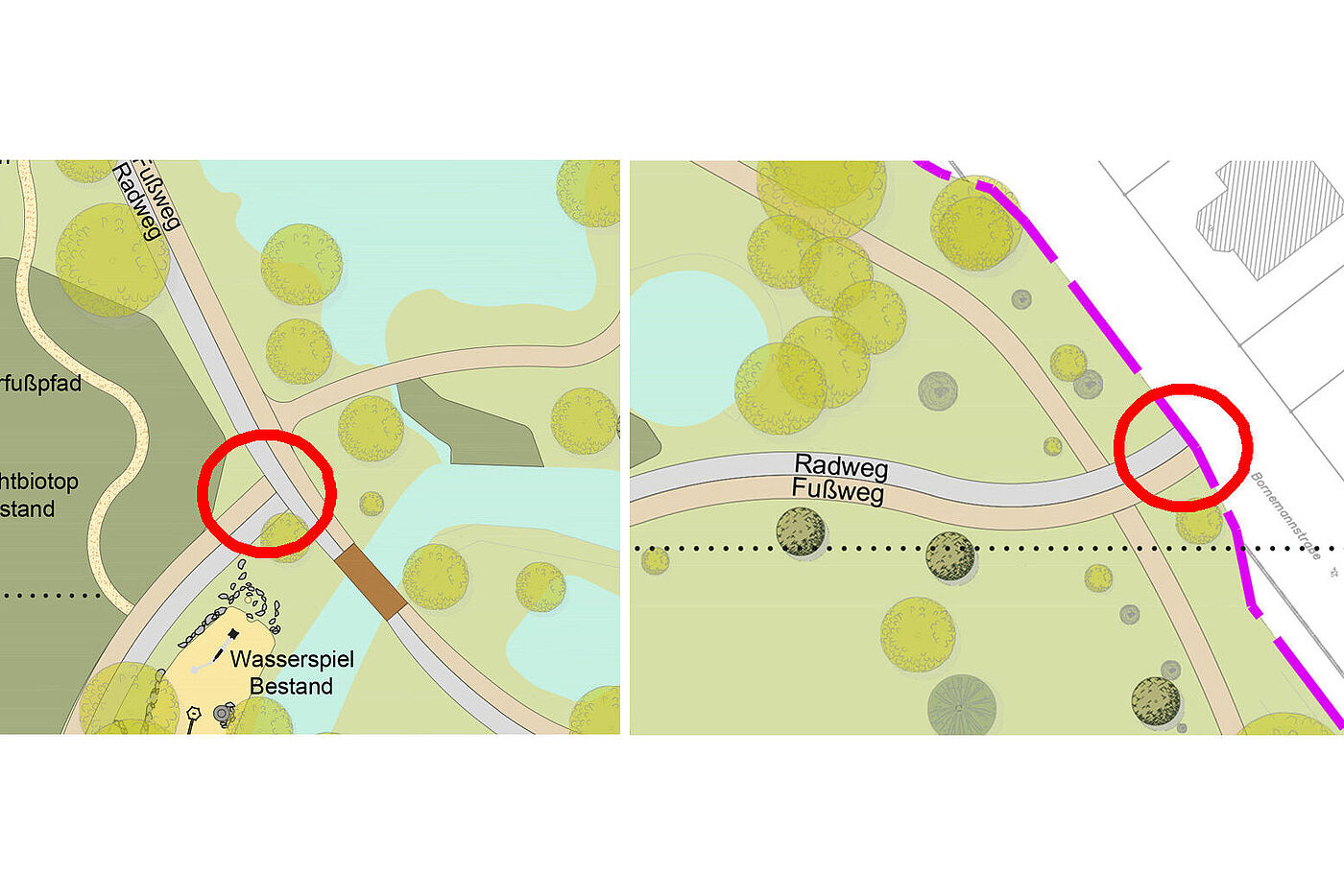 An Kreuzungspunkten der Hauptwege mit anderen Wegen im Park oder mit Straßen, wie beispielsweise der Bornemannstraße, ist die Anlage einer trichterförmigen Erweiterung notwendig. Die Gestaltung hat entsprechend zu erfolgen, da Radfahrer keine abrupten, rechtwinkligen Wendungen vollziehen, sondern einen angemessenen Kurvenradius für ein sicheres Ein- und Abbiegemanöver benötigen.